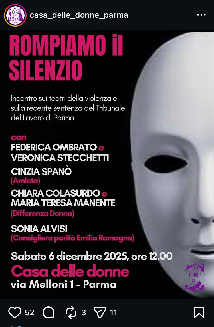 Una prima iniziativa denominata “Rompere il silenzio”, incontro sui teatri della violenza e sulla sentenza del Tribunale del Lavoro di Parma, si terrà domani alla Casa delle Donne alle ore 12. Interverranno diverse protagoniste, qui la locandina.