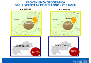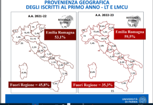 Un altro dato di grande rilievo è la capacità di attrazione degli iscritti da fuori Parma e da fuori regione: secondo gli ultimi dati, sono fortemente aumentati gli iscritti residenti a Parma, e questo rappresenta un’importante inversione di tendenza rispetto a quanto avveniva storicamente. I fuori regione iscritti al primo anno nel ‘22-’23 sono stati il 35%, un 10% secco in meno.