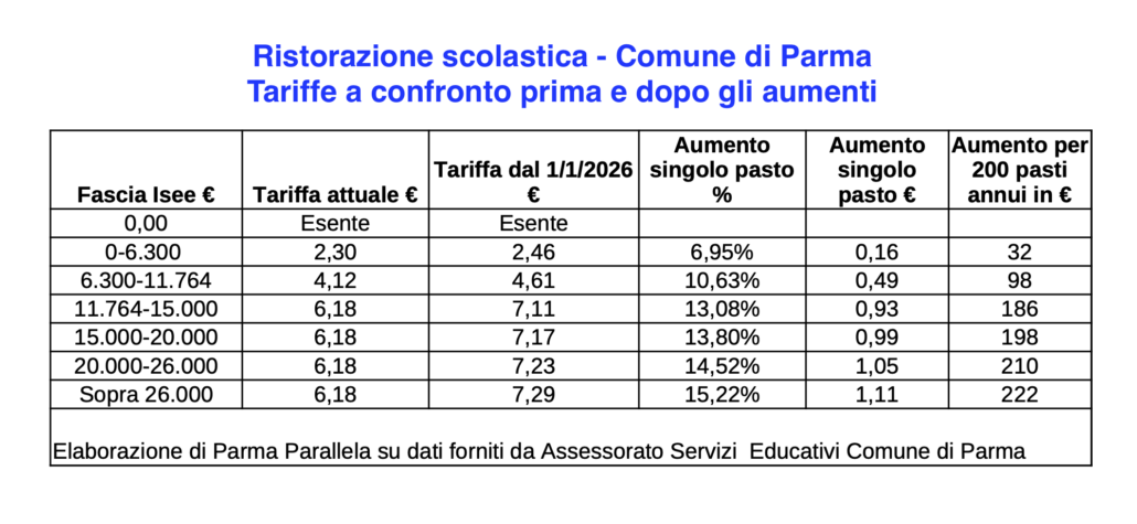 Abbiamo interpellato l’assessora Caterina Bonetti sulla questione del rincaro mense. La sua risposta precisa innanzitutto che “A Parma le famiglie con i redditi più bassi continueranno a beneficiare di tariffe tra le più accessibili della regione, con esenzioni e agevolazioni confermate. La quota minima (escluso chi esente) passerà da 2,30 a 2,46 euro a pasto, mentre quella medio bassa da 4,12 a 4,61: un aggiornamento necessario dato che le tariffe erano ferme da oltre 12 anni, ma contenuto, e soprattutto equo. Parma si colloca, anche con questo adeguamento tariffario, in linea con gli altri comuni capoluogo della nostra Regione”.